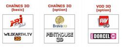 Cette annonce est un tantinet anticipée dans la mesure où en réalité seule une chaîne 3D est actuellement disponible. Il s'agit de NRJ12 3D qui sera suivie en octobre par WildearthTV 3D. Deux chaînes qui font partie du bouquet basique. En octobre, la chaîne Brava 3D s'ajoutera en option, et toujours en option, Penthouse 3D mais pour 2011 cette fois.